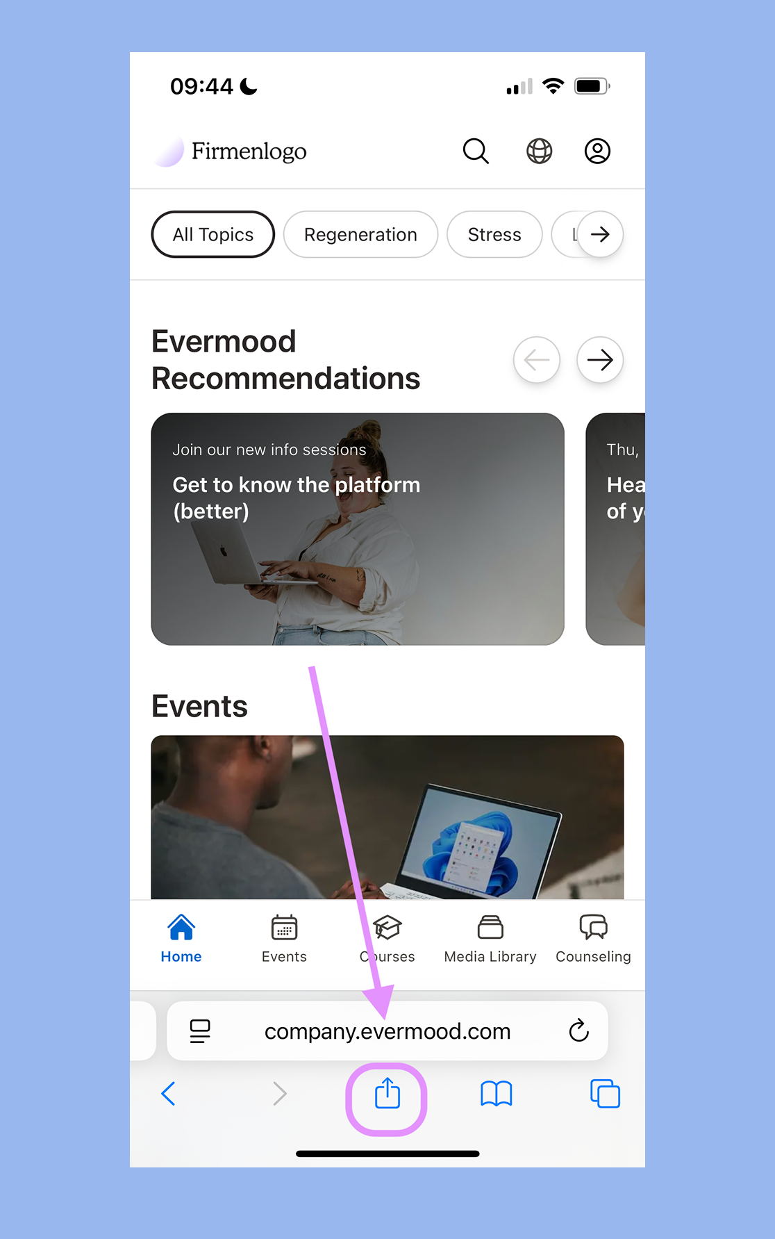 https://yourorganisation.evermood.com/.Tap the share icon at the bottom center of your screen.