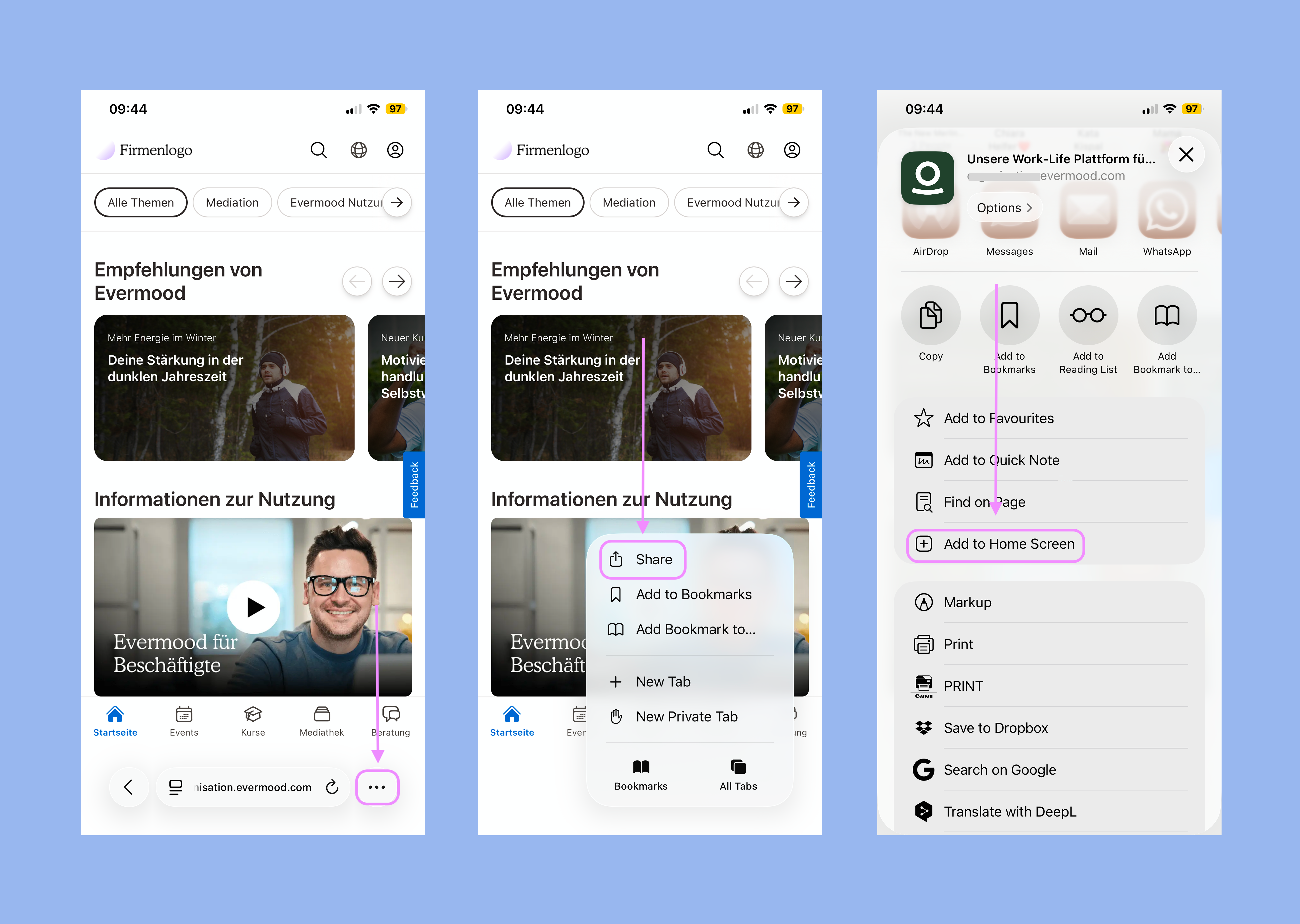 https://yourorganisation.evermood.com/.In your browser menu, tap Share and select Add to Home Screen .