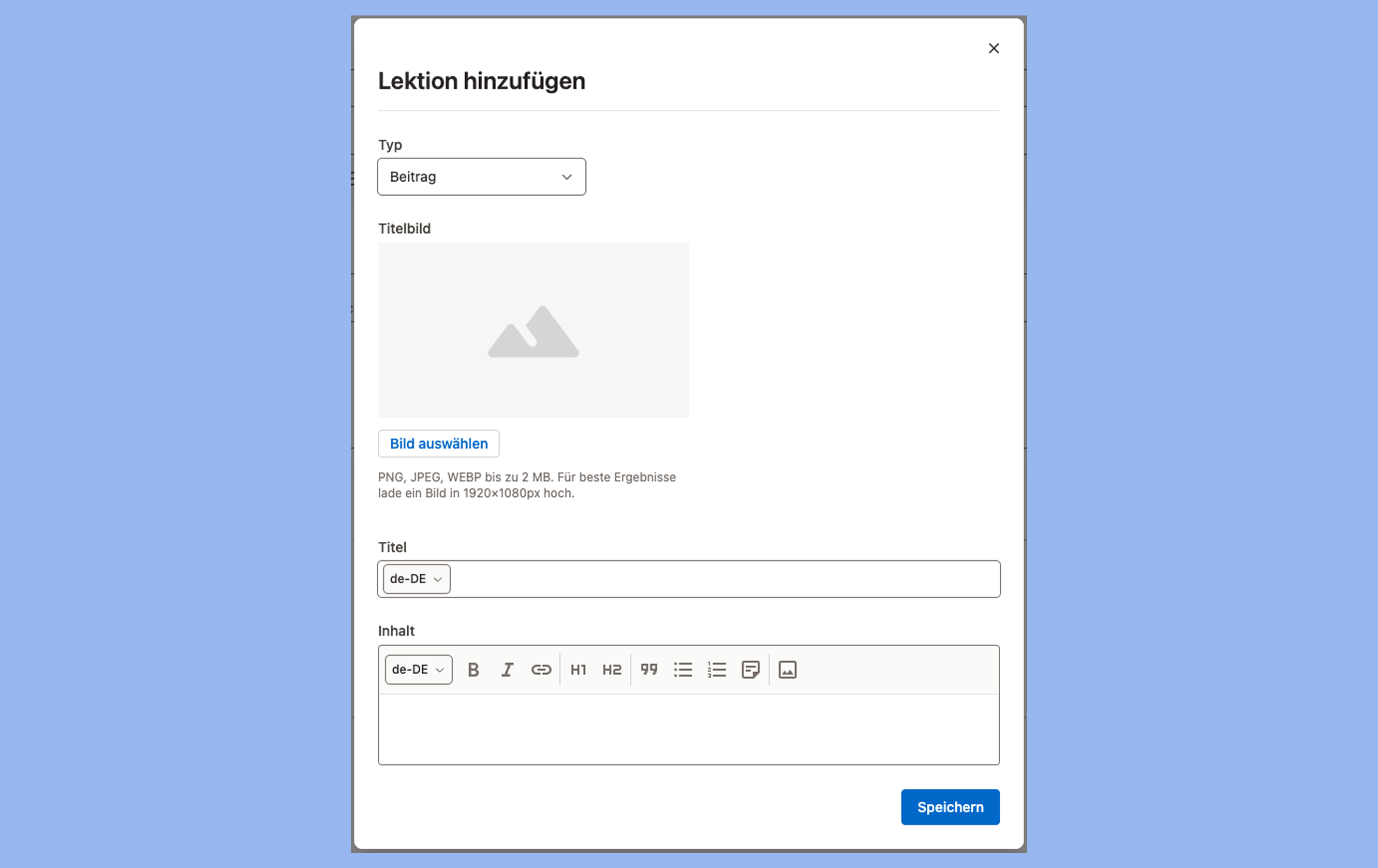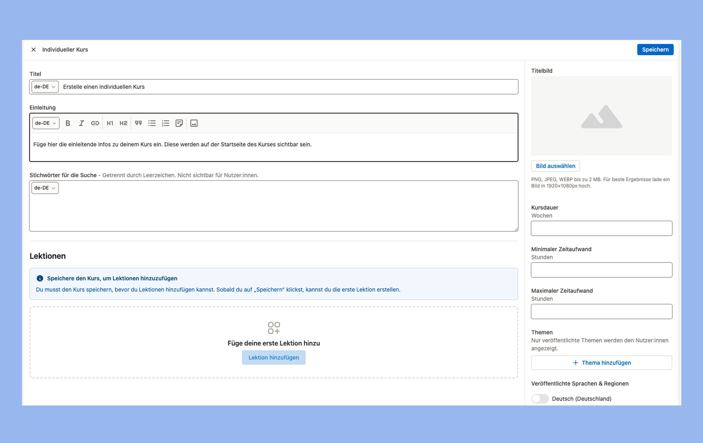 - Gib einen Titel ein, verfasse den Inhalt der Lektion und füge ein Titelbild hinzu.
