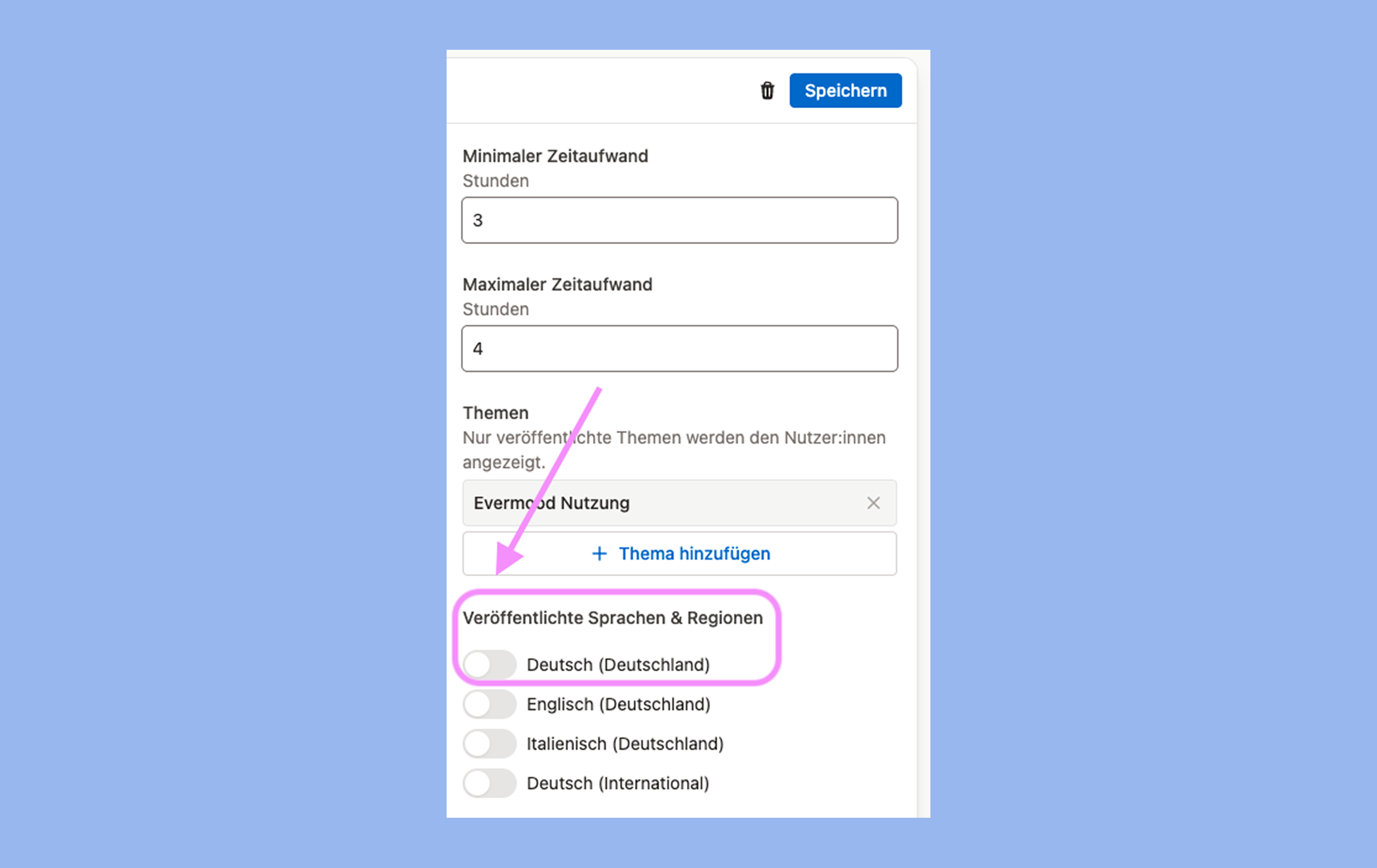 - Veröffentliche deinen ersten eigenen Kurs indem du die entsprechenden Sprachen bei „Veröffentlichte Sprachen & Regionen“ aktivierst.